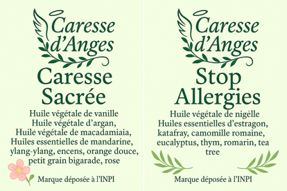 Synergie olfactive caresse Nocturne ,lâcher prise au moment du sommeil,et se réveiller en toute sérénité. Composé de lavande, petit grain de bigarade , camomille romaine, marjolaine à coquille, orange douce, mandarine,rose. Hv,vanille/rose de musquée ,vitE