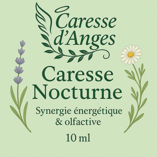 Synergie olfactive caresse Nocturne ,lâcher prise au moment du sommeil,et se réveiller en toute sérénité. Composé de lavande, petit grain de bigarade , camomille romaine, marjolaine à coquille, orange douce, mandarine,rose. Hv,vanille/rose de musquée ,vitE